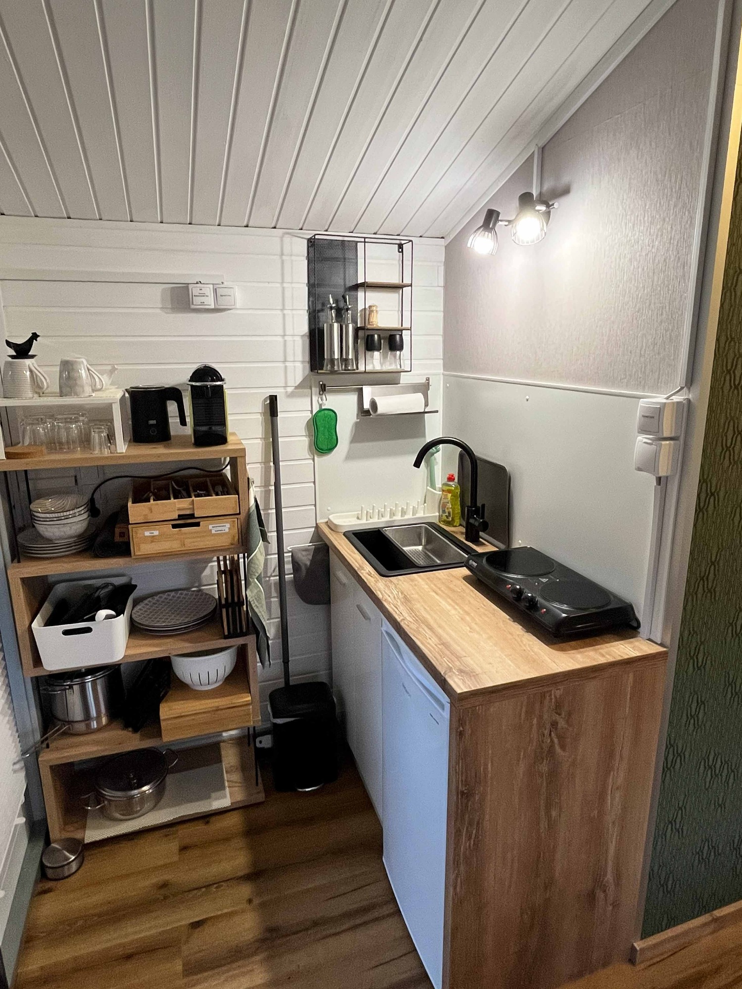 Kleine Küche mit Kühlschrank, Wasserkocher, Nespresso-Maschine, Spüle, Doppelkochplatte sowie Geschirr und Töpfe