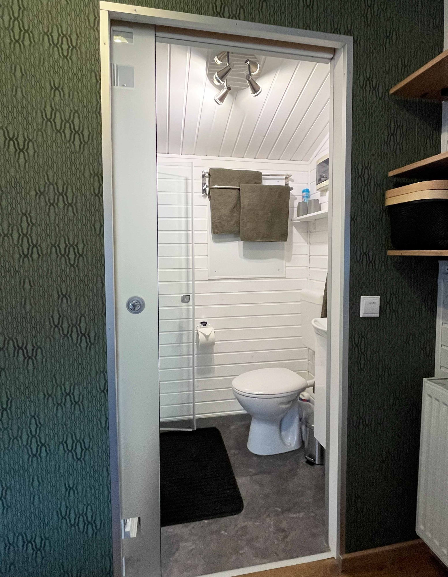 Badezimmer mit begehbarer Dusche, WC und Waschbecken