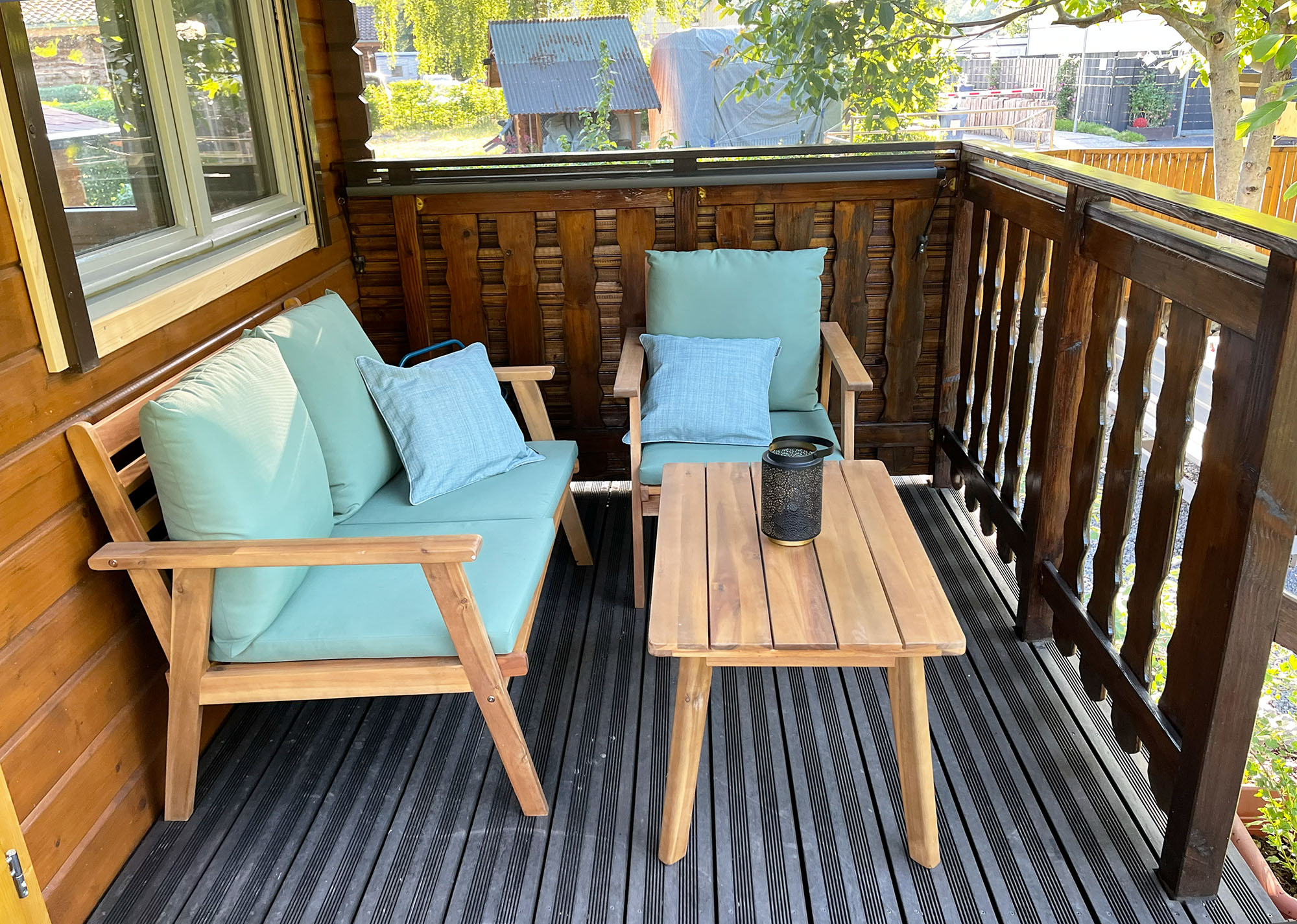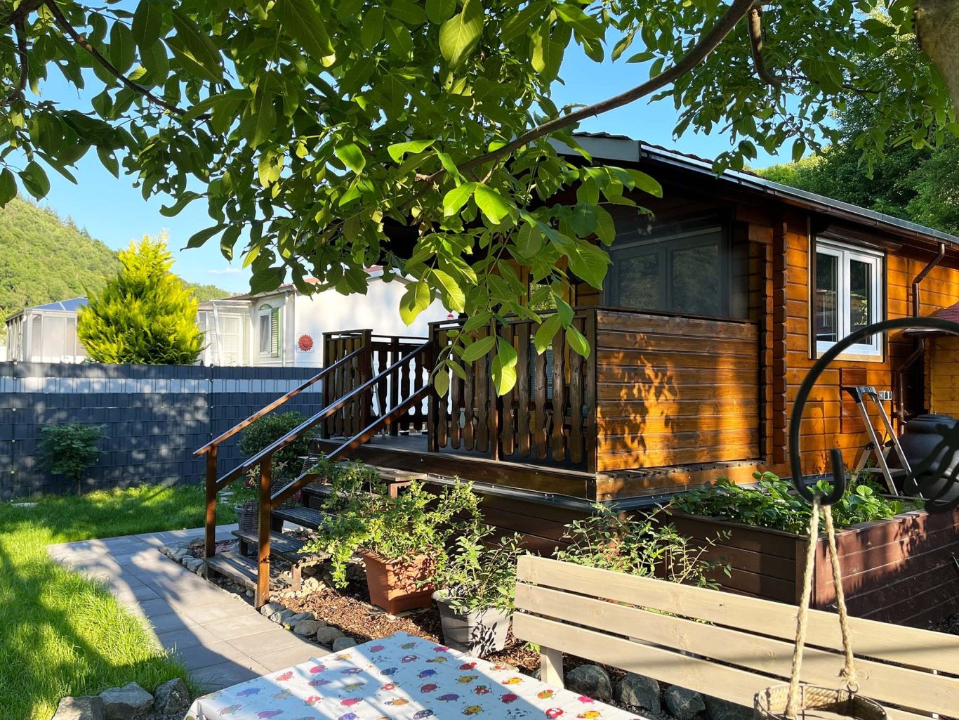 Von der überdachten Veranda aus lässt sich der Tag entspannt ausklingen. Die gemütliche Lounge-Ecke mit Blick ins Grüne und auf die Lahn lädt zum Verweilen ein.